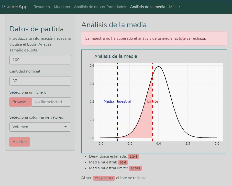Esta página muestra los resultados del análisis de la media. Al igual que en la página de Análisis de no-conformidades, aquí puedes ver un gráfico representativo de estos resultados.