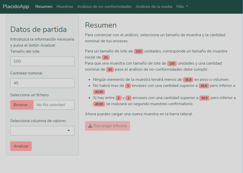 Para comenzar introduce el tamaño del lote que deseas analizar y la cantidad nominal de tus envases. En la pestaña resumen podrás ver el tamaño de la muestra que necesitas tomar.